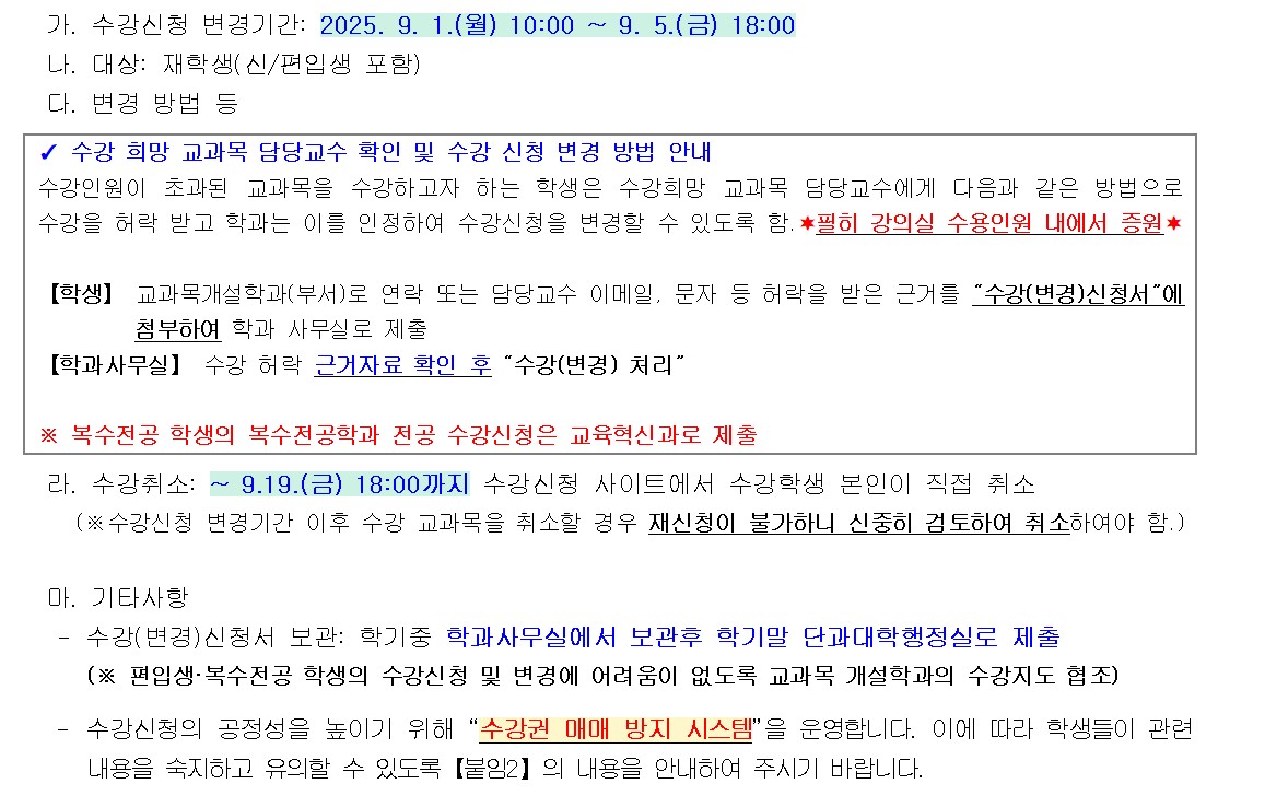 2025학년도 2학기 수강신청 변경 및 취소 안내