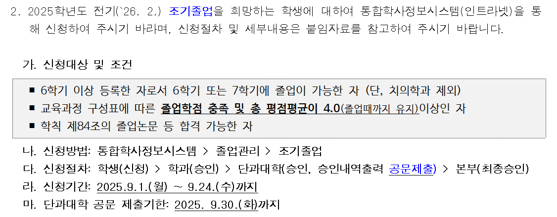 2025학년도 전기(26. 2.) 조기졸업 신청 안내
